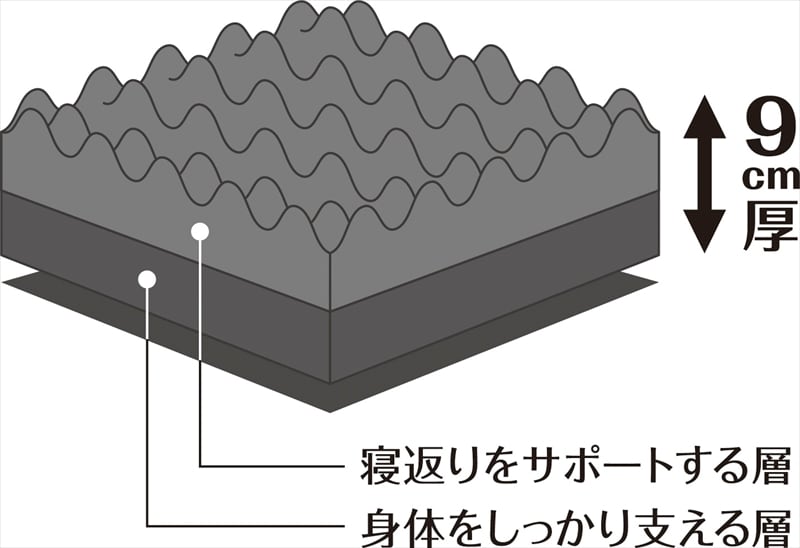 点で支えるマットレスです。凹凸構造が身体の圧を分散し、体にかかる負担を軽減します。湿気がこもりにくい為、使用後はお部屋に立てかけるだけでいいので便利です。ふとんを干す必要もありません。