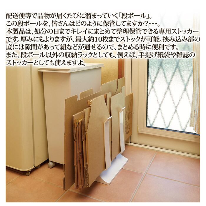 配送便等で品物が届くたびに溜まっていく「段ボール」。この段ボールを、皆さんはどのように保管してますか?。本製品は、処分の日までキレイにまとめて整理保管できる専用ストッカーです。厚みにもよりますが、最大約10枚までストックが可能。挟み込み部の底には隙間があって紐などが通せるので、まとめる時に便利です。また、段ボール以外の収納ラックとしても、例えば、手提げ紙袋や雑誌のストッカーとしても使えますよ。