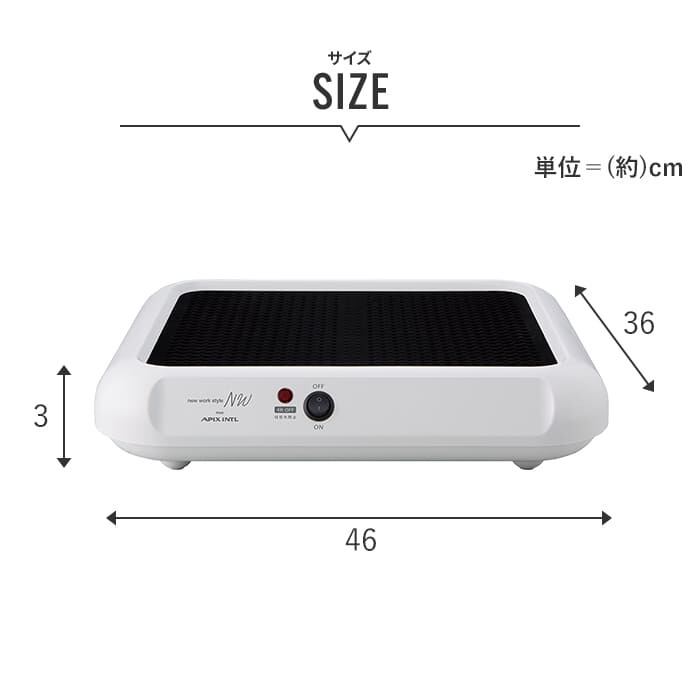 無音・無排気で、デスクワーク中の使用にも適しており、コンパクトタイプなのでオフィスのデスク下やリビングにおいても邪魔になりません。